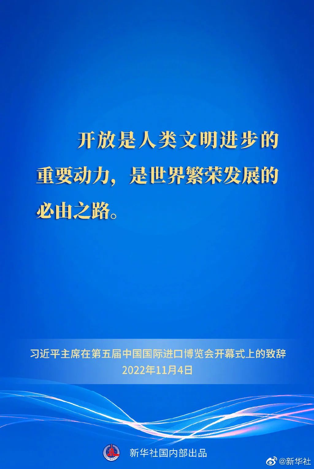 11月4日晚,國家主席習近平以視頻方式出席在上海舉行的第五屆中國國際進口博覽會開幕式并發表題為《共創開放繁榮的美好未來》的致辭。