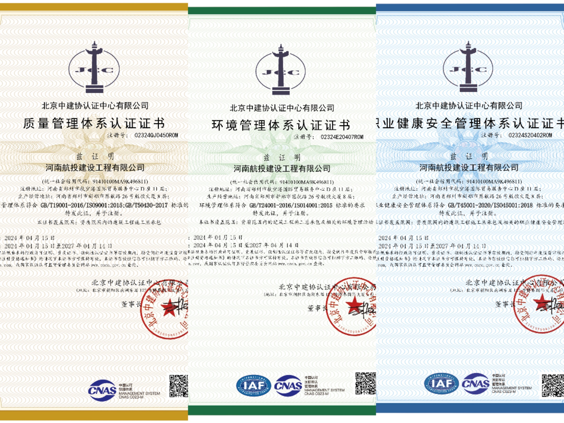 4月15日,河南航投建設工程有限公司(以下簡稱航投建工)通過ISO9001質量管理體系、ISO14001環境管理體系、ISO45001職業健康安全管理體系(以下簡稱ISO三體系)認證并獲得證書,這標志著航投建工的規范化標準化管理邁上新臺階,為持續提升市場競爭力、拓展合作新領域打下堅實基礎。