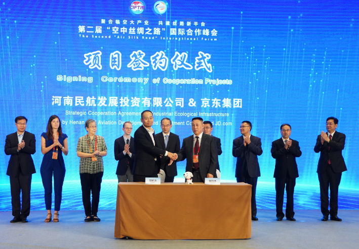 在隨后的成果發布環節,河南航投總經理、黨委副書記、副董事長劉建葆代表公司分別與中航通用飛機有限公司(以下簡稱航空工業通飛)、法國Simaero控股公司、中國檢驗認證(集團)公司(以下簡稱中檢集團)、京東集團簽署戰略合作協議。黃強及中外嘉賓代表見簽。趙磊主持發布圖書《“一帶一路”高質量發展——河南“空中絲綢之路”的生動實踐》。該書以紀實筆觸全方位記錄了河南主動融入“一帶一路”建設,向天尋路,架起一條互利各國交通運輸、聚合經貿文化發展的“空中絲綢之路”,真實展現出河南打造內陸開放新高地、實現中原更出彩的新局面。