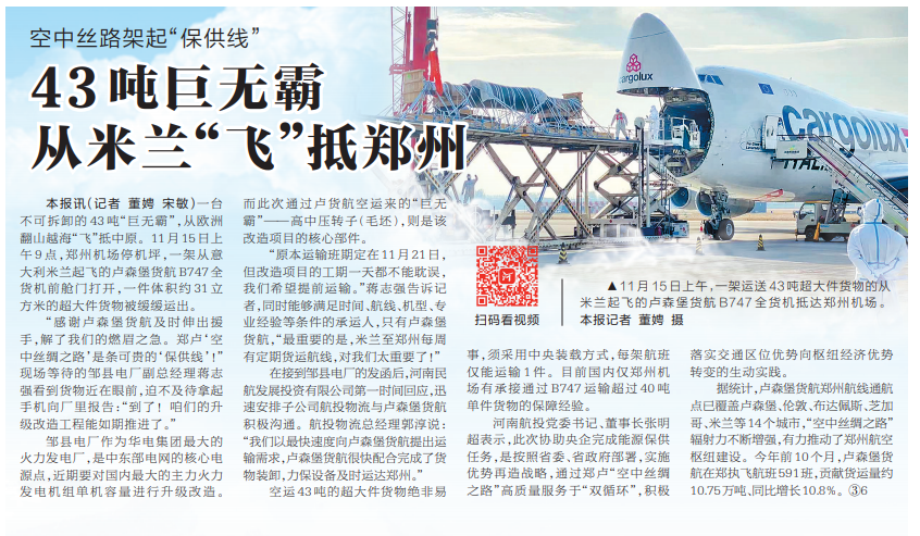 在接到鄒縣電廠的發函后,河南民航發展投資有限公司第一時間回應,迅速安排子公司航投物流與盧森堡貨航積極溝通。航投物流總經理郭淳說:“我們以最快速度向盧森堡貨航提出運輸需求,盧森堡貨航很快配合完成了貨物裝卸,力保設備及時運達鄭州。”